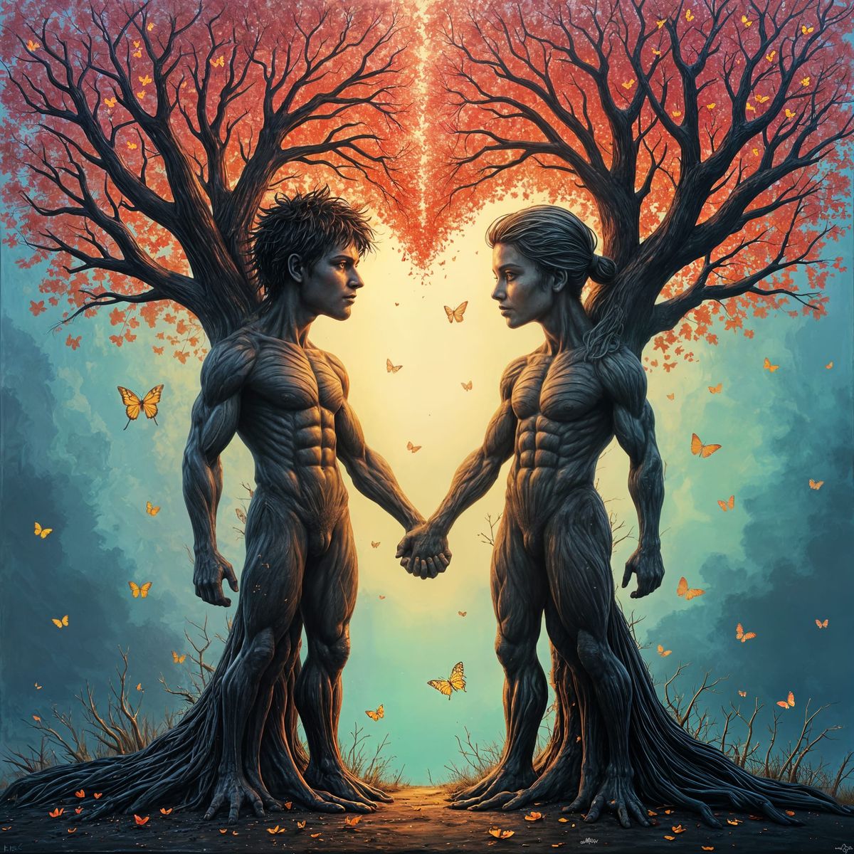 This image shows two muscular figures, a male and female, grown as trees holding hands. The bark shimmers with light, and butterflies and glowbugs create a celebratory atmosphere in this colorful polychromatic splash art.