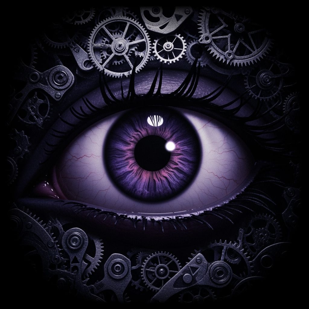 This image shows a dark purple eye in a cinematic style. The image evokes the aesthetic of 1950s noir films with film grain and vignette effects.