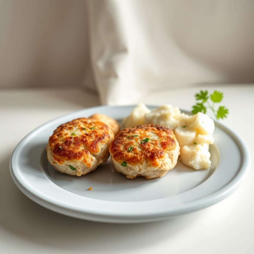 This image shows homemade chicken patties served on a baby plate with mashed potatoes. The photo features a warm, minimalist aesthetic with soft lighting, similar to a Beatrix Potter illustration.