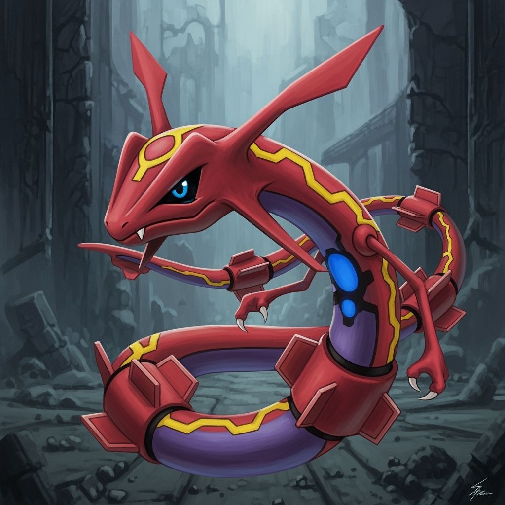 This image shows a serpent-like Rayquaza Pokémon with a red and purple color scheme and blue eyes. The detailed matte background and rich colors evoke a fantastical concept art style.