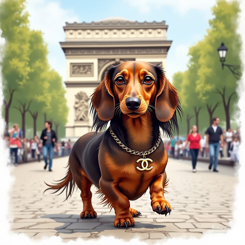 A long-haired dachshund wearing a Chanel necklace strolls along the Champs-Élysées with the Arc de Triomphe visible in the background. The vibrant artwork is in a contemporary illustrative style.