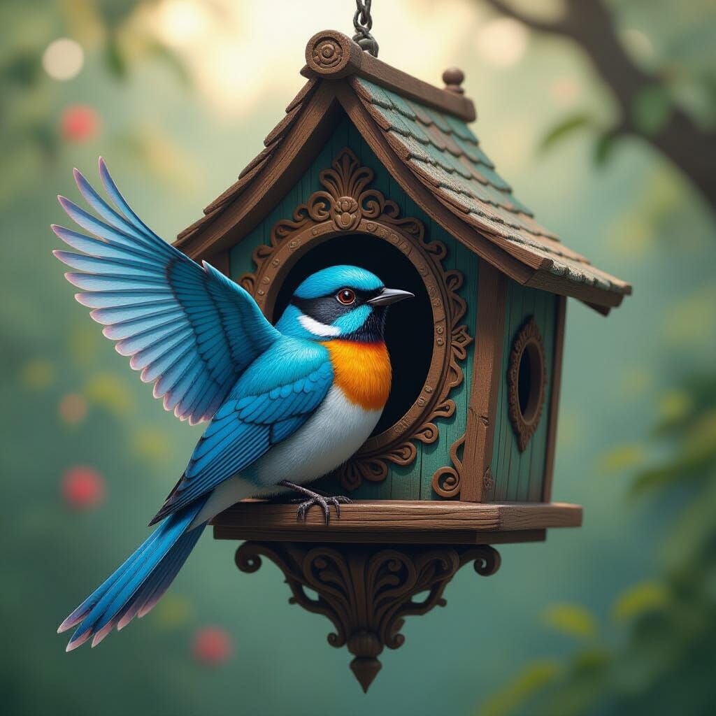 This detailed matte painting features a vibrant, fantastical bird emerging from an intricate birdhouse. Deep, complementary colors and splash screen aesthetics create wonder and depth, inspired by fantasy concept art.