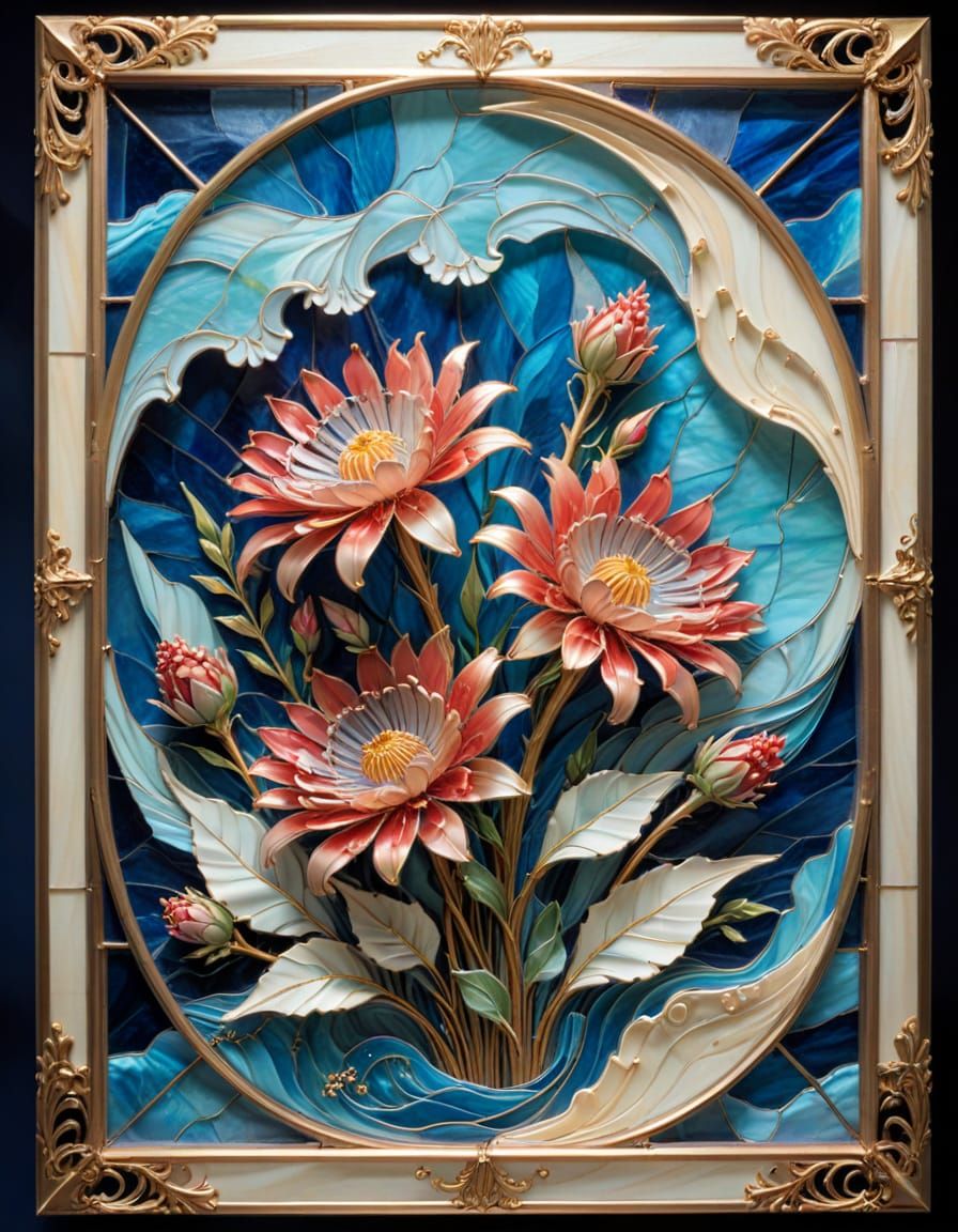 This opulent stained glass artwork features red aster flowers in a gold filigree frame, set against a blue and cream background. Victorian-inspired, it evokes an ethereal, romantic fantasy style.