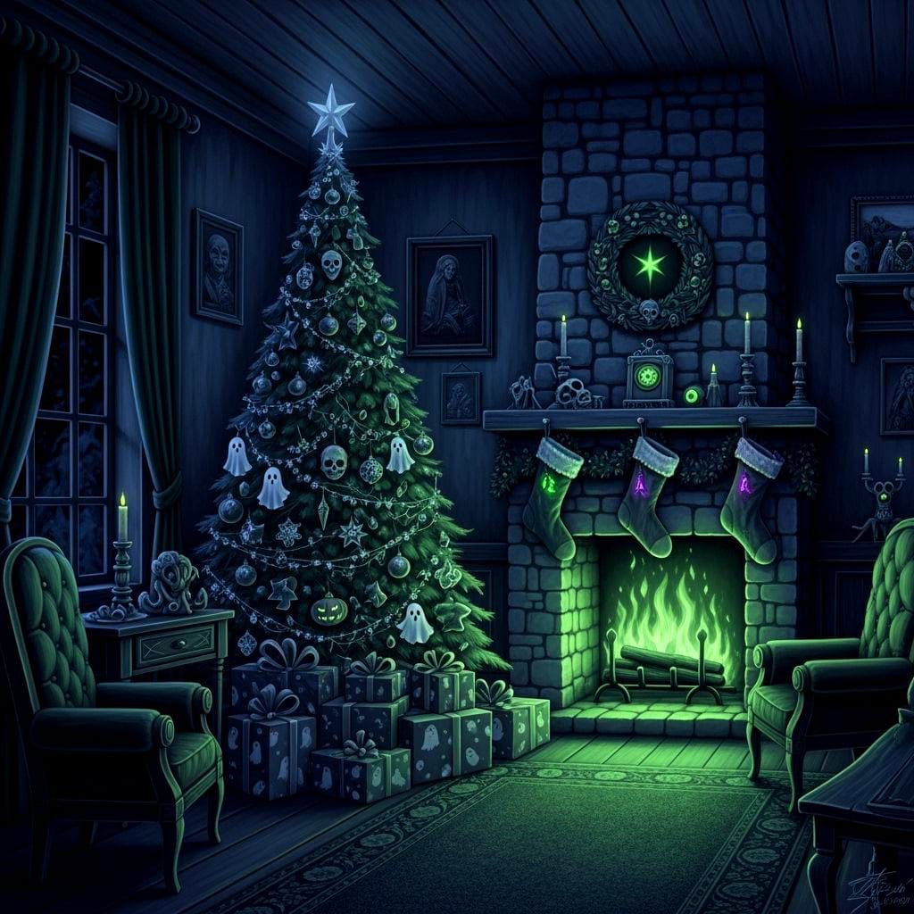 This image depicts a ghost-haunted parlor decorated for Christmas with a Halloween twist. Features include a tree with spooky ornaments and a fireplace with green flames, in a high fantasy style.