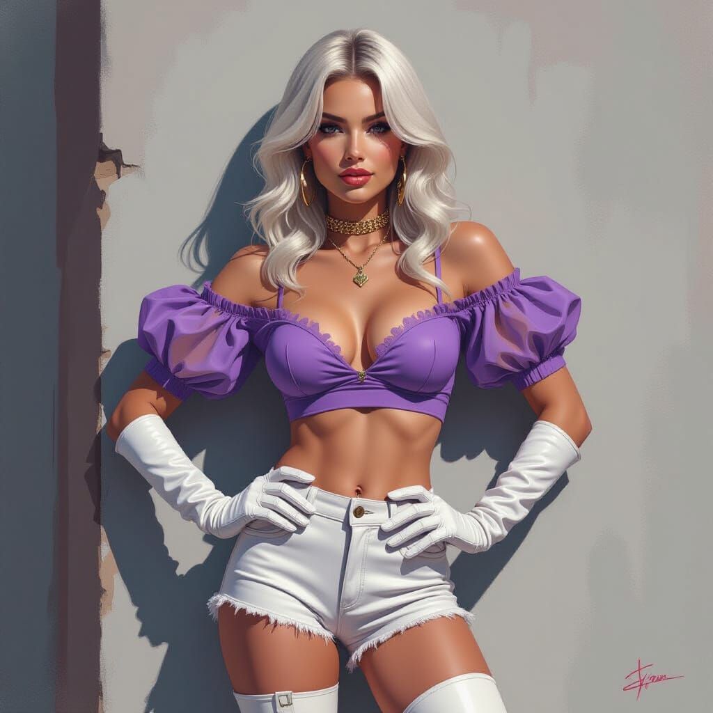 Photo realistic, watercolor with oil tinting, detailed, full body, longshot, oven woman plus direct eye contact standing, leaning against a wall. Her medium length platinum hait, styled in updo. She wears white knee-high leather boots with buckles, a bold asymmetricdeep lavender crop top With sheer puffed, ...