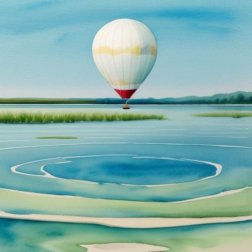 This image shows a close-up watercolor painting of a balloon gently landing on water. Soft focus and ripples enhance the serene and calming atmosphere, with a gentle color palette.