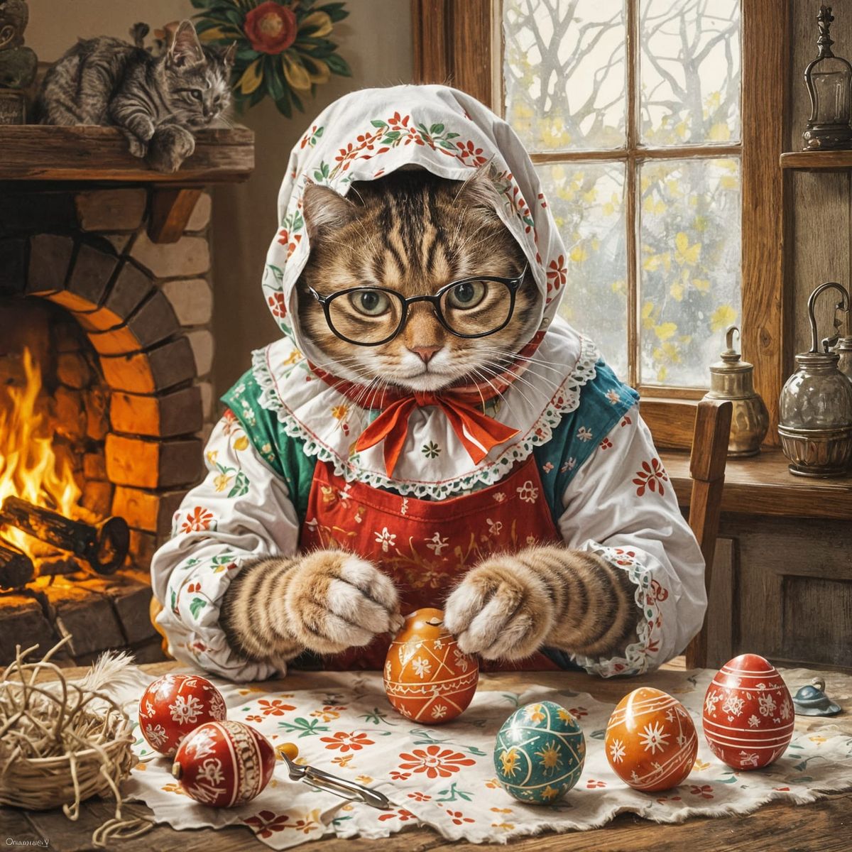 A charming image shows a cat in a babushka and apron decorating Pysanky eggs in a cozy kitchen. The image is reminiscent of realist oil paintings.