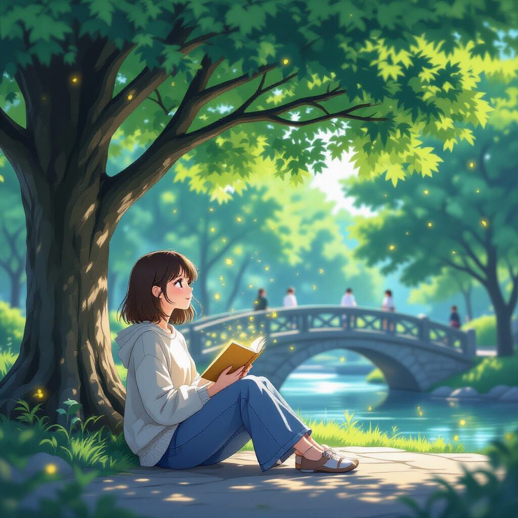 This image shows an anime girl reading a book under an evergreen tree, surrounded by glowing fireflies. The scene is depicted in a painterly, surreal style with a calm atmosphere.