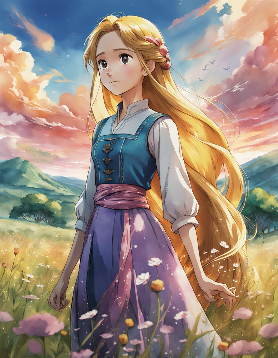 A beautiful anime-style image of Rapunzel in a sunny meadow. The artwork features soft, pastel details and vibrant golden hair, reminiscent of watercolor paintings with cinematic composition and natural lighting.