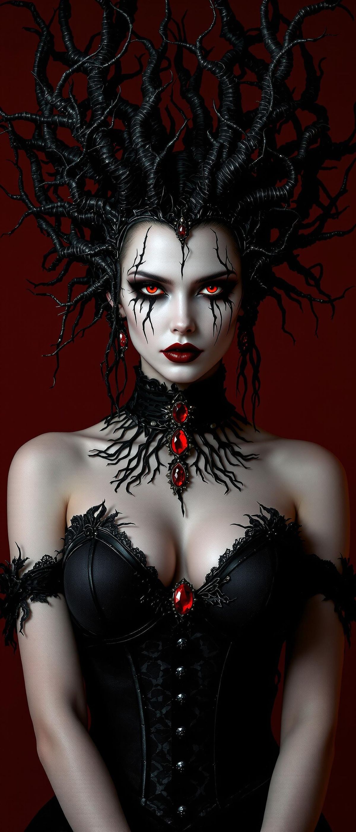 This image shows a gothic woman with red eyes and intricate makeup. She wears a black gown and ornate headdress against a deep red backdrop, rendered with dynamic lighting.