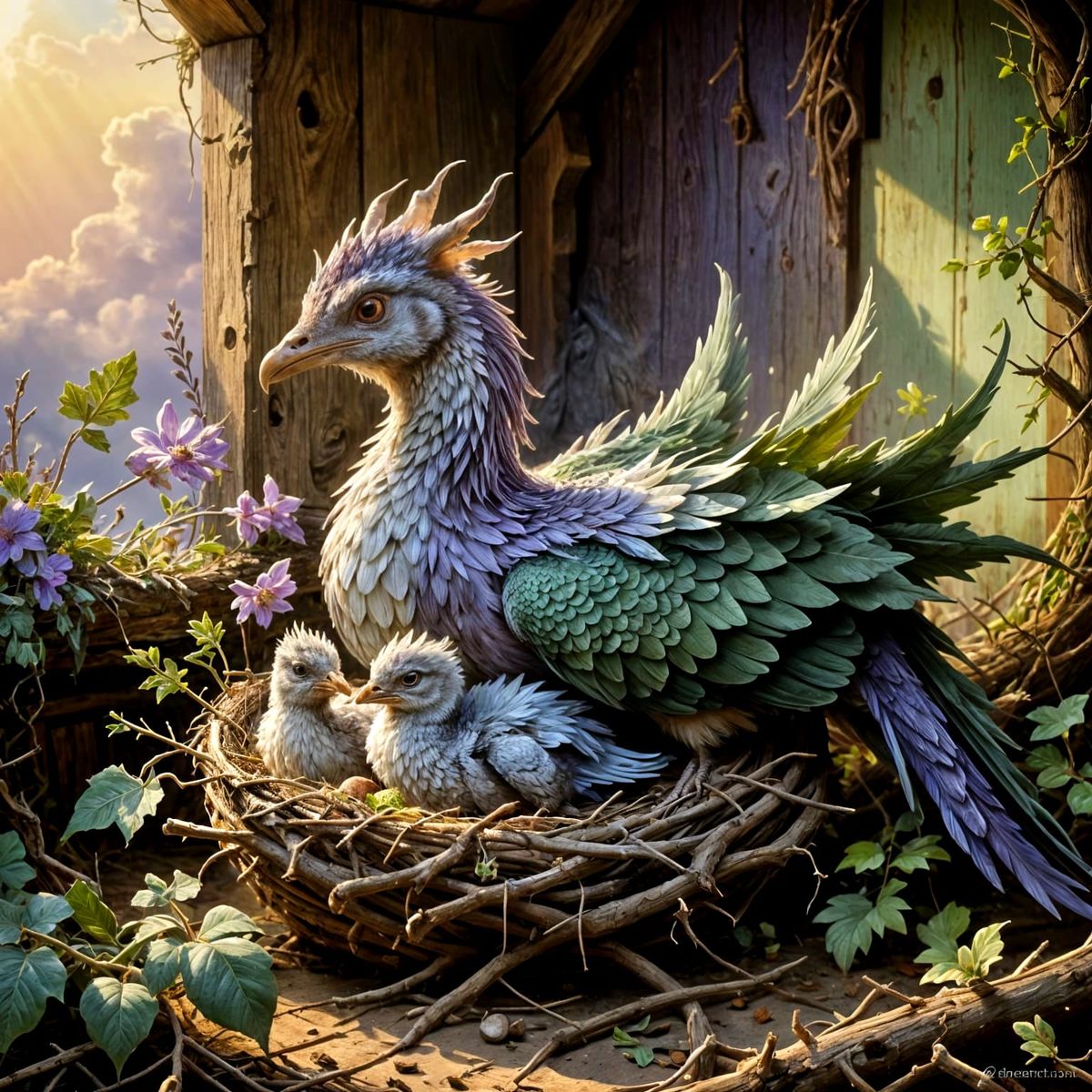 A Wyandotte hen shelters a baby dragon with purple and green scales under her wing. This hyper-detailed, rustic scene is rendered in an ethereal, misty landscape style reminiscent of romanticism.