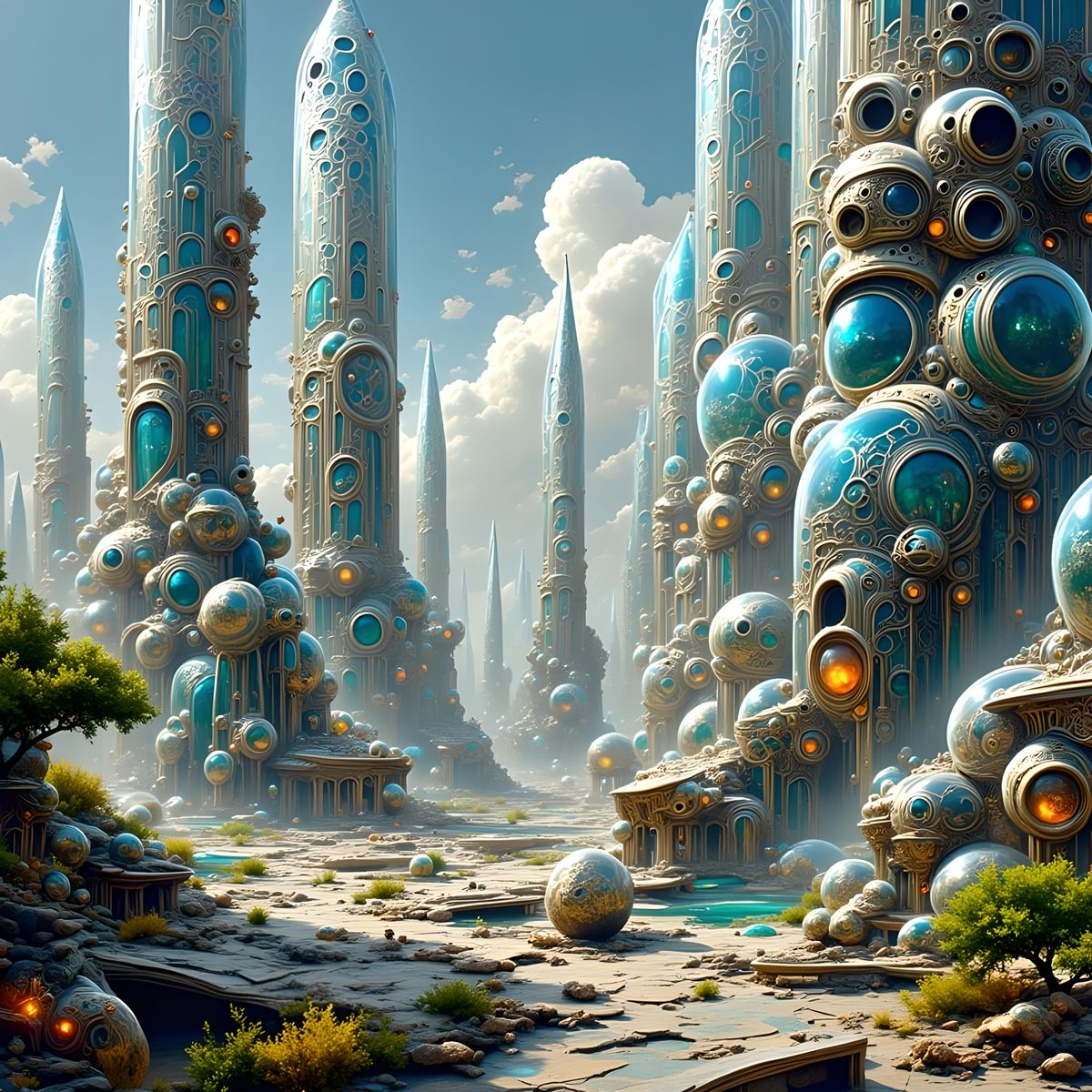 A vibrant image showcasing a retrofuturistic city with dieselpunk and atompunk elements. The city features glass towers, spires, and orbs, reminiscent of digital art.
