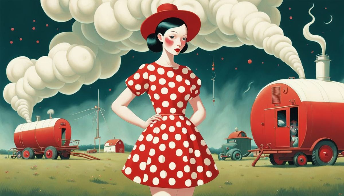 This image shows a comedic cow in a bold red and white polka dot dress, set against a surreal backdrop of a farm tornado, a futuristic reactor, and a vintage-inspired wagon. The artwork combines elements of science fiction and fantasy.