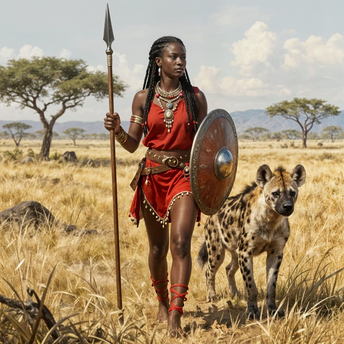 This image shows a determined Maasai warrior woman with braided hair and a red outfit, walking with a hyena beside her on the savannah. It is rendered in a detailed fantasy illustration style.