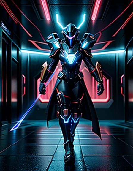 This image shows a cybernetic warrior in black and gold armor standing in a neon city. The artwork has a comic book aesthetic and features glowing blue circuits, metallic accents, and laser shockwaves.
