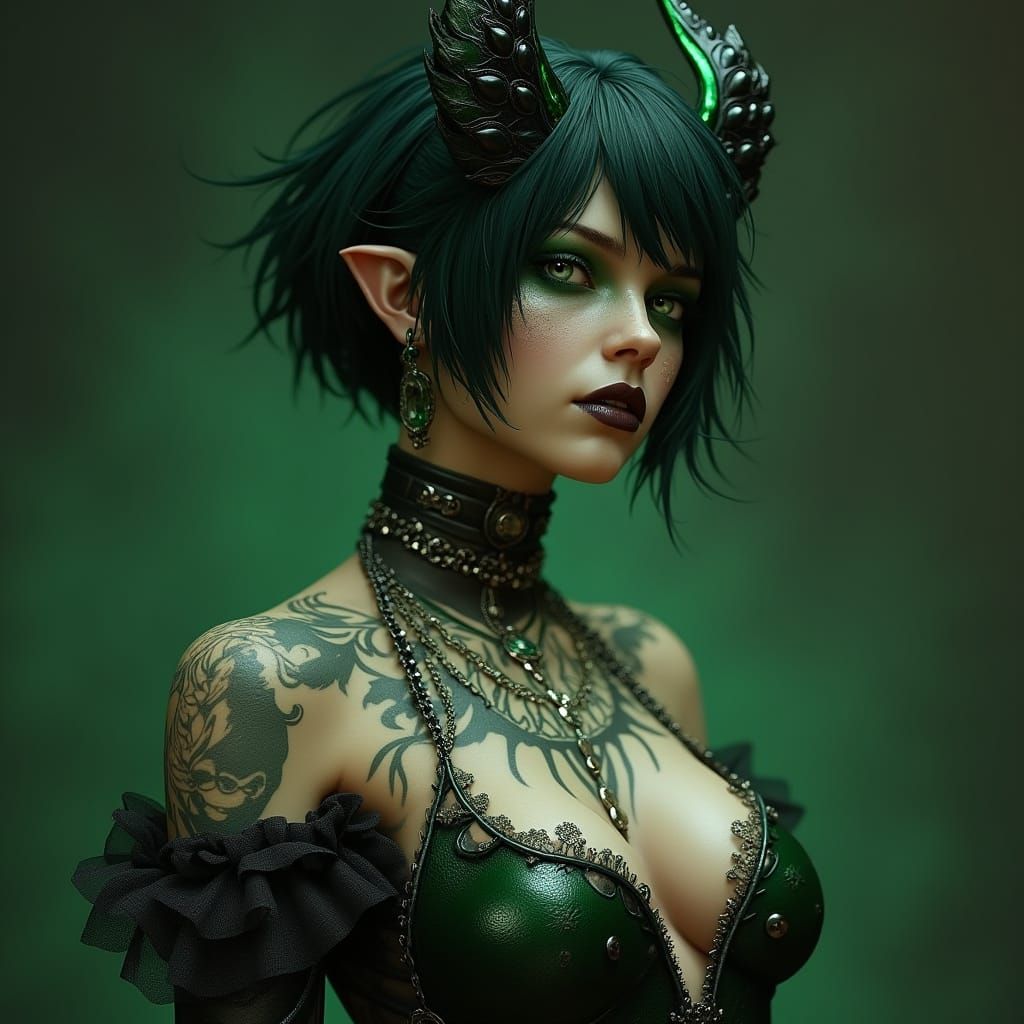 This image depicts a stunning female demon embodying the sin of Envy, surrounded by a dark fantasy world with intricate details and an epic atmosphere, rendered in a hyper-realistic style.