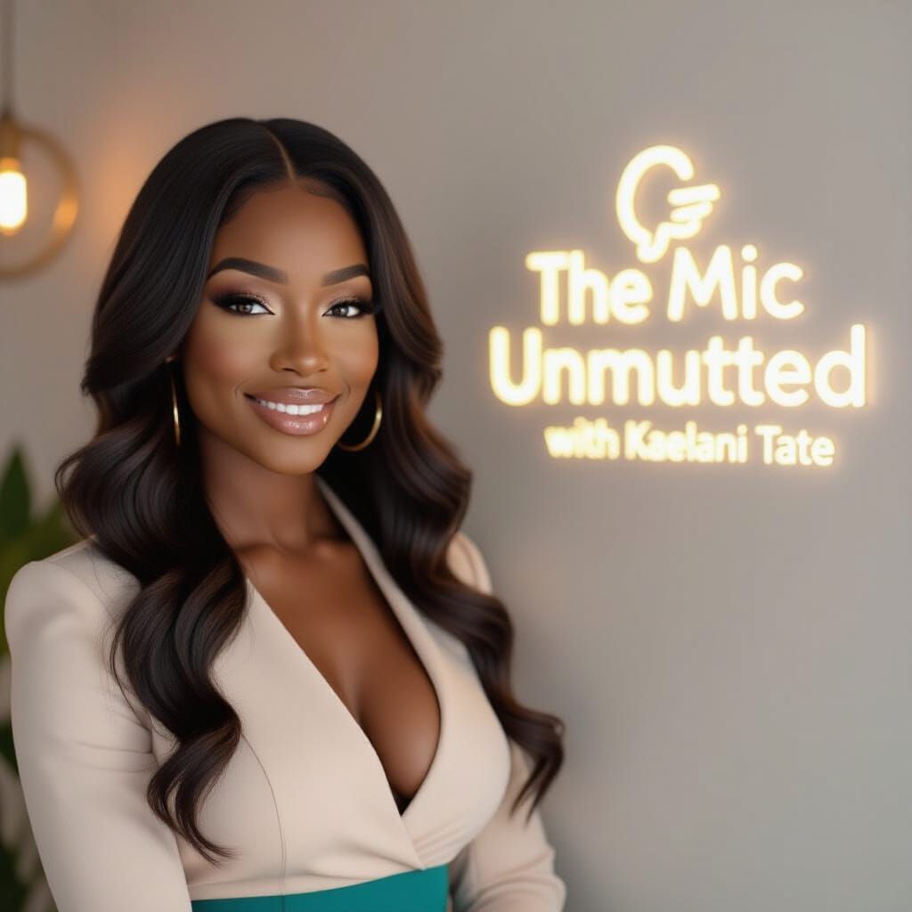 This image shows a beautiful dark-skinned Black woman with expressive eyes and full lips, glowing with soft glam makeup. Cinematic photography captures her professional and approachable energy in a studio setting.