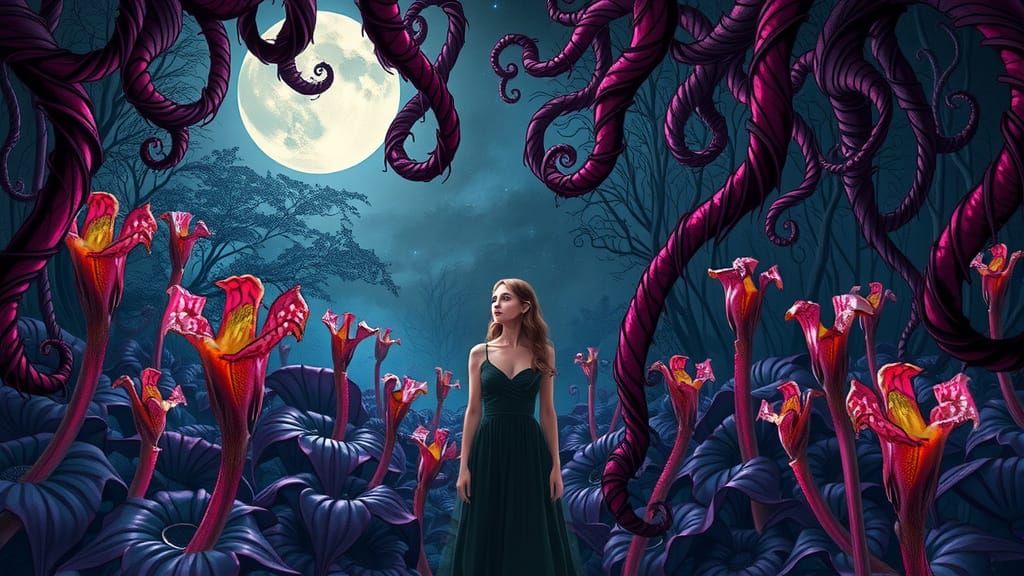 A surreal scene of a woman in a dark, mystical garden. Towering carnivorous plants and eerie purple flora with clawed leaves fill the space, illuminated by a full moon. The image features deep saturation and intricate details in an alcohol ink style.