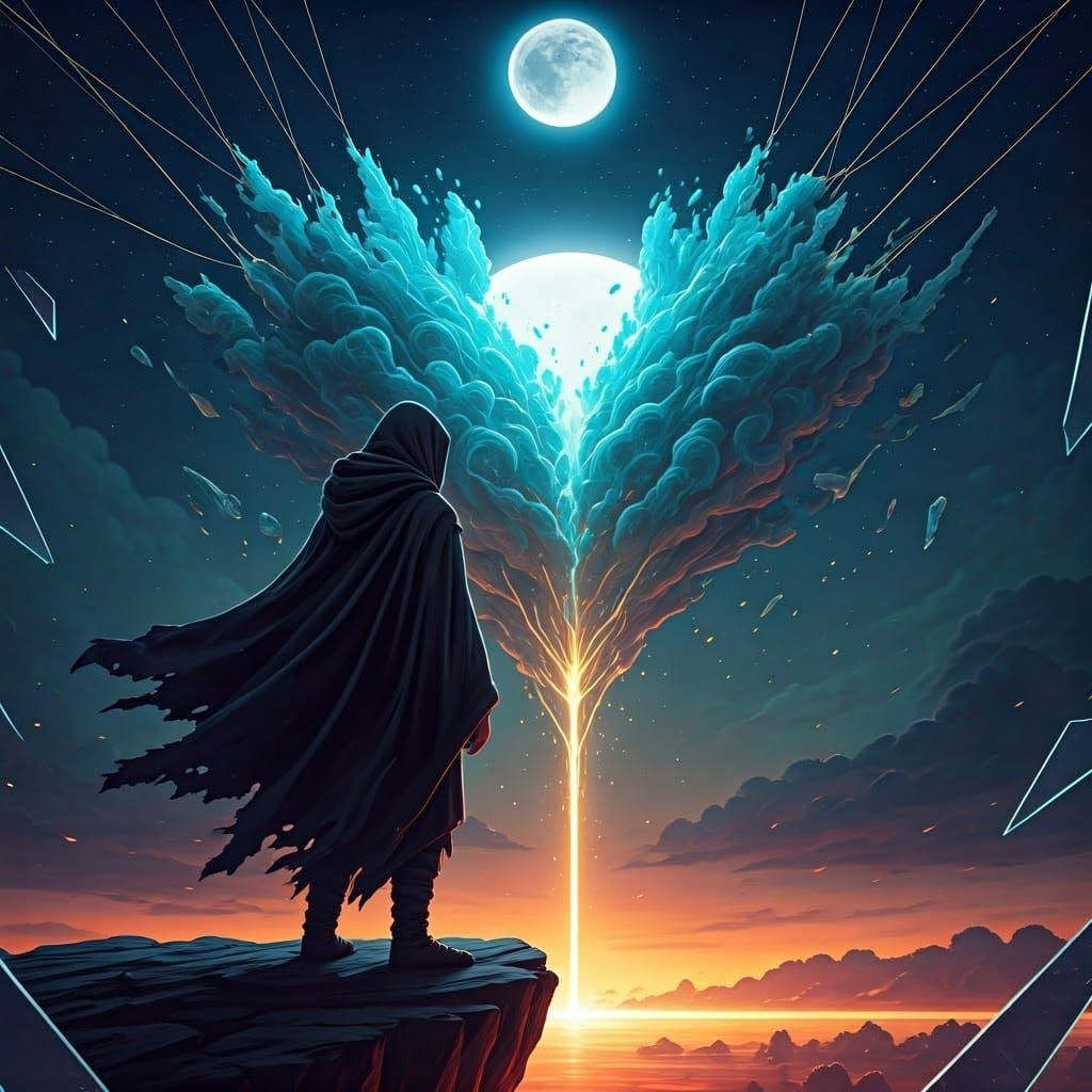 This image shows a lone figure overlooking a psychedelic color battle, balanced between light and shadow, framed by shattered glass. The scene blends yearning and hope in a triadic color scheme, reminiscent of trending splash art.