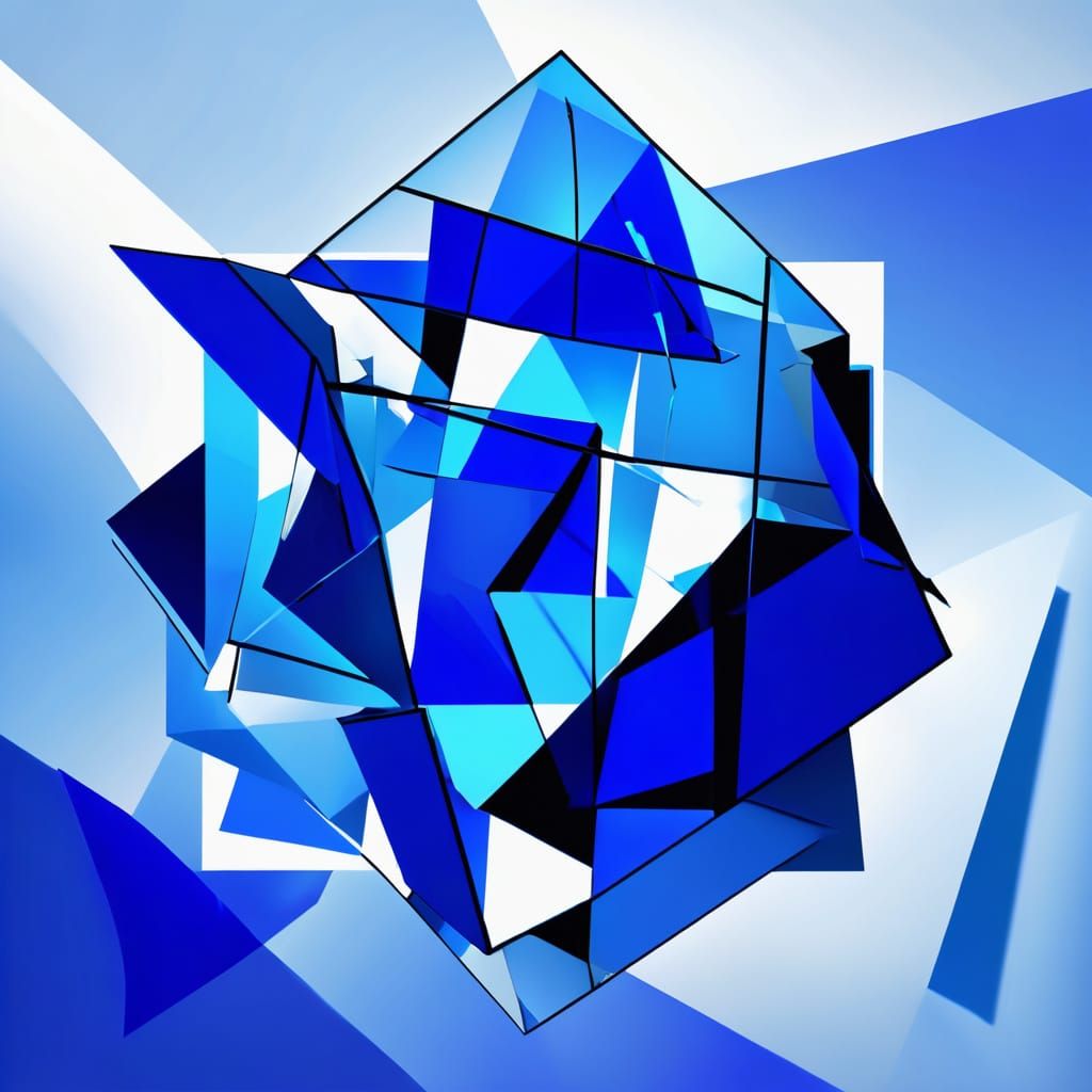 This striking image captures a woman standing on a throne of ice, surrounded by dark blue shadows, in a dreamlike atmosphere. Geometric shapes and fragmented surfaces blend with soft blue tones, from cobalt to azur, creating an otherworldly ambiance.