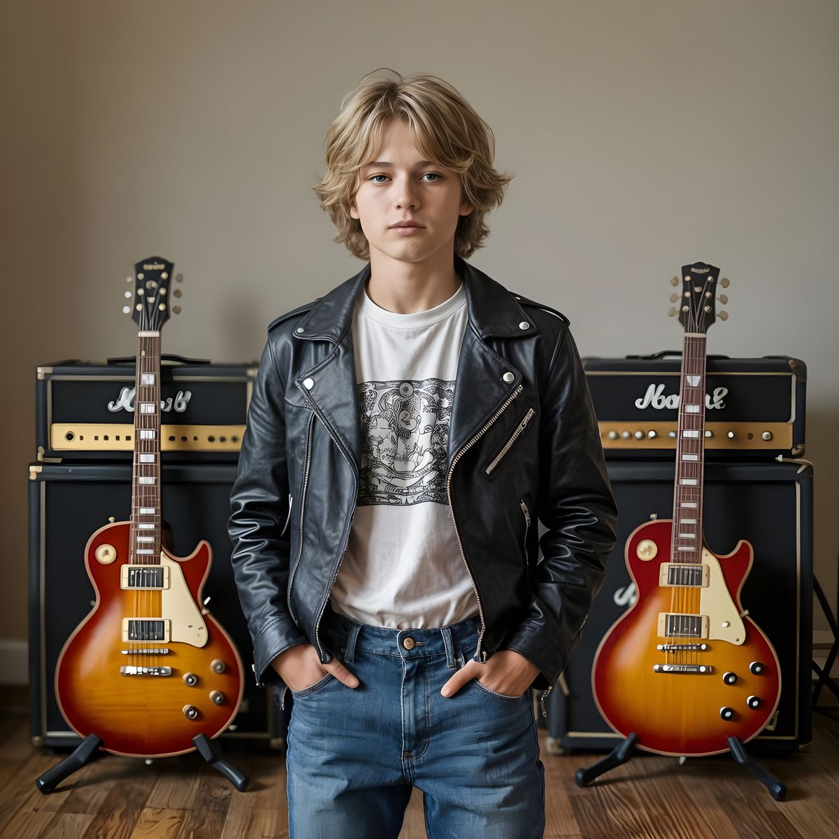 A digital image depicts a handsome teenage boy with blond hair, wearing ripped jeans and a leather jacket. Marshall guitar amps are visible in the background, along with Flying V and Explorer guitars.