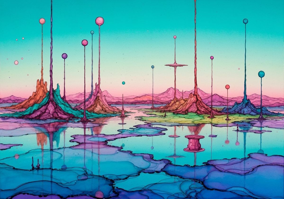This image showcases a vibrant and absurd landscape created using the fluid, organic style of alcohol ink.