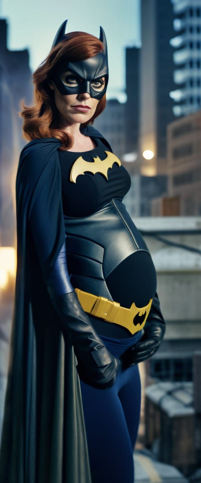 This image shows a pregnant superheroine wearing a batgirl cowl and utility belt. She is set against a Gotham cityscape at dusk, bathed in golden hour lighting with vibrant colors, rendered photorealistically.