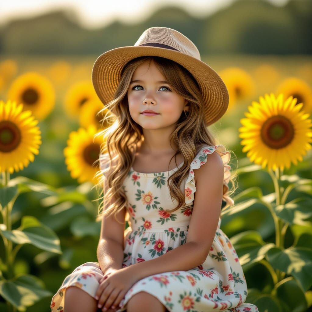 This image shows a young girl in a sundress and hat, sitting on a sunflower. The girl is squinting in the bright sunlight. The image is hyperrealistic, with a cinematic and moody atmosphere.