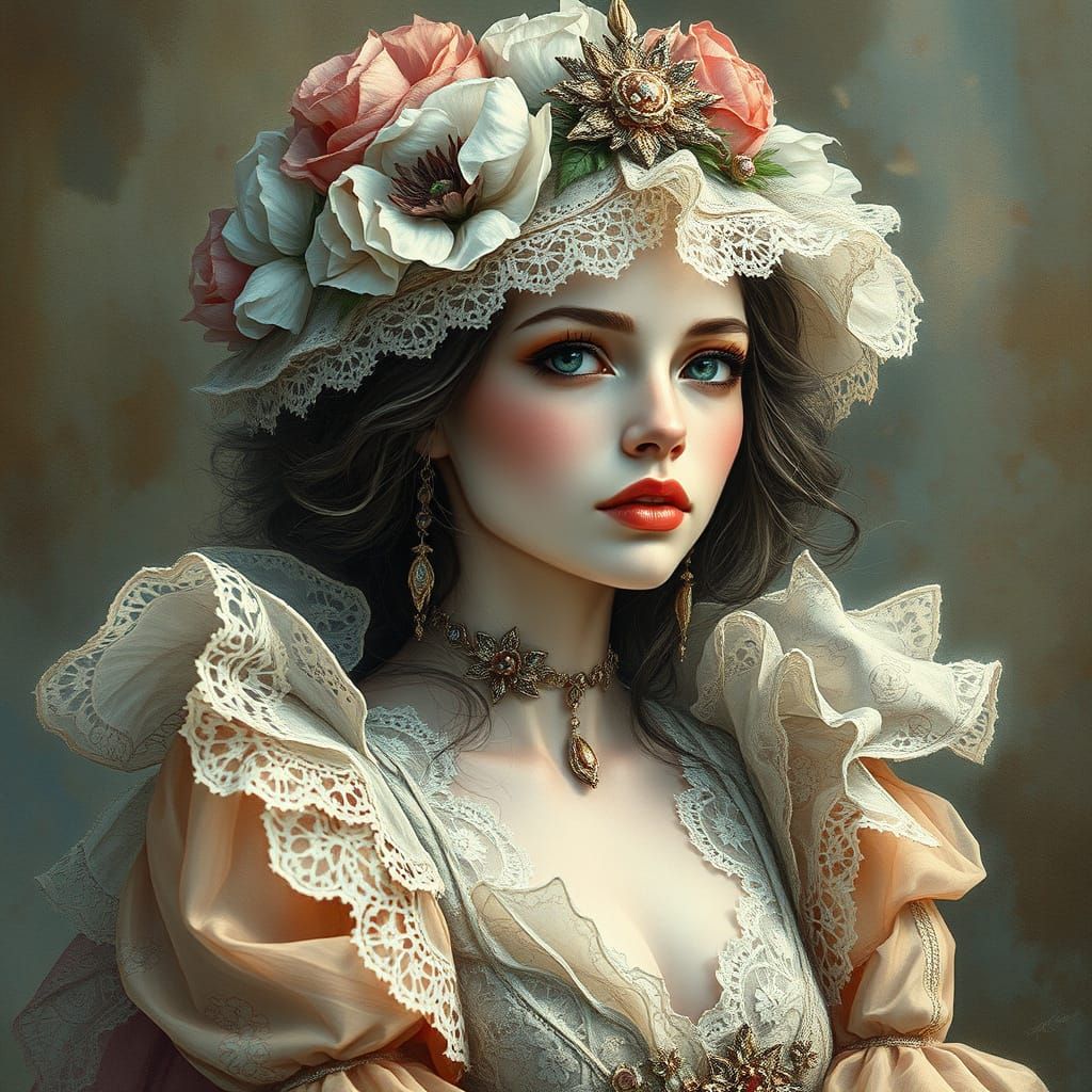 This enchanting image features a mystical cyber siren princess draped in intricate, Victorian-inspired finery, with a blend of watercolor, pencil sketch, and aged parchment textures. Soft, ethereal light and delicate details evoke a sense of wonder, as if infused with magic.