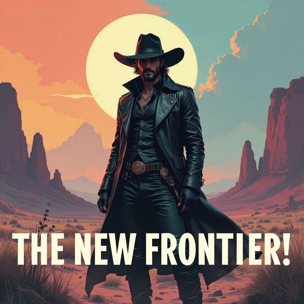 This image shows a celebrity pioneer in a leather duster and hat, striking a heroic pose in a mystical landscape. The artwork blends dark fantasy and pop art with bold lines and vibrant colors.