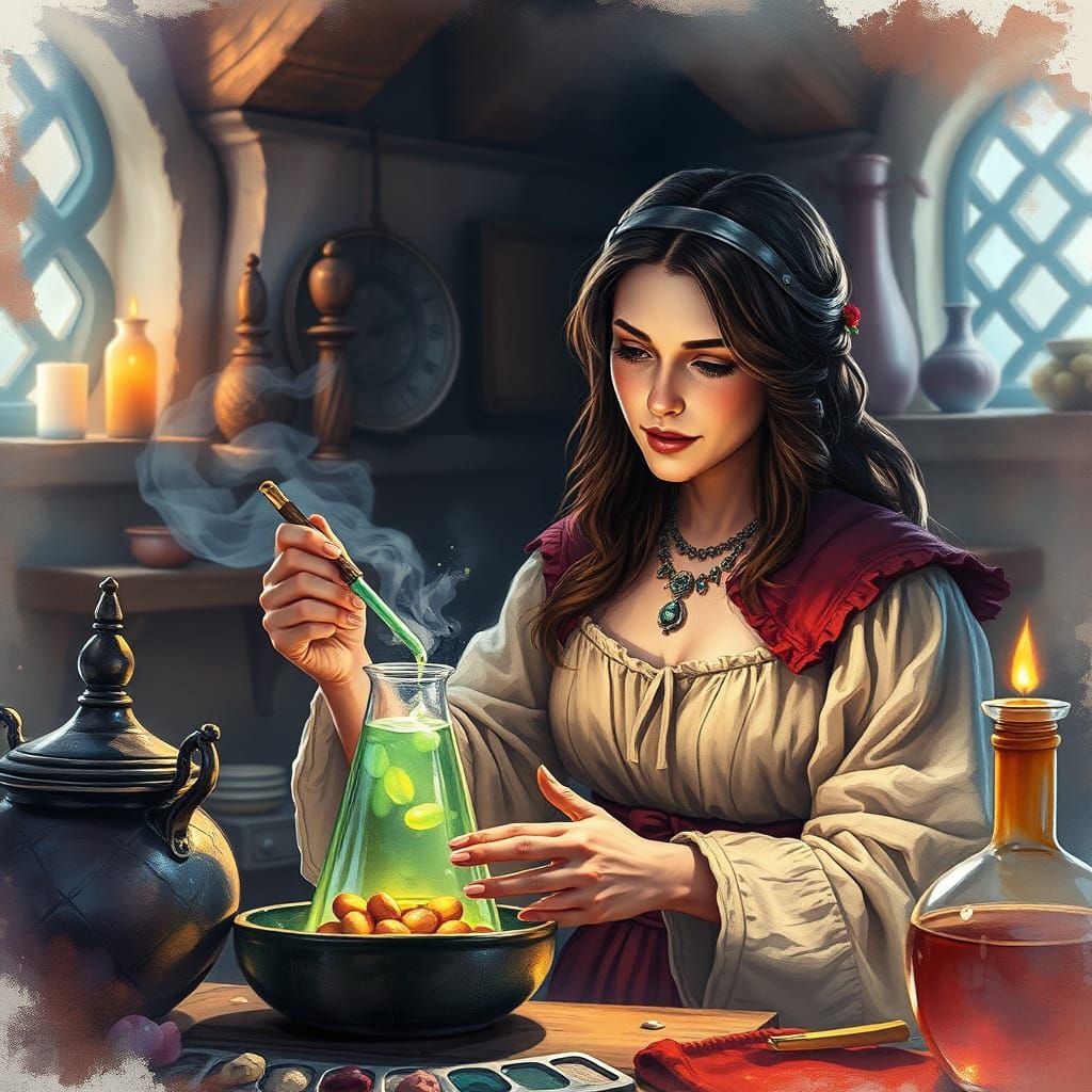 A delicate watercolor painting of a middle-aged woman creating a love potion in a medieval kitchen. The art features a detailed matte painting with deep, complementary colors.