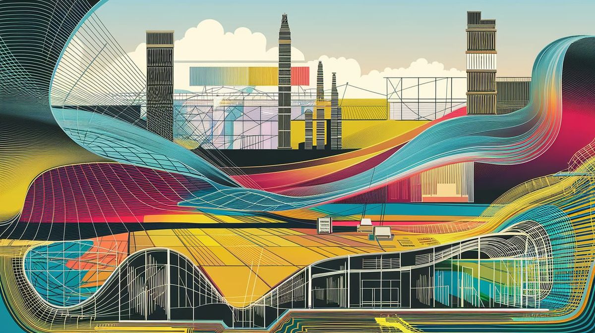 This image shows a futuristic graphic score featuring intricate sheet music notation and architectural plans in a patent illustration-style precision, blending Op Art and Constructivism with a dash of experimental music
