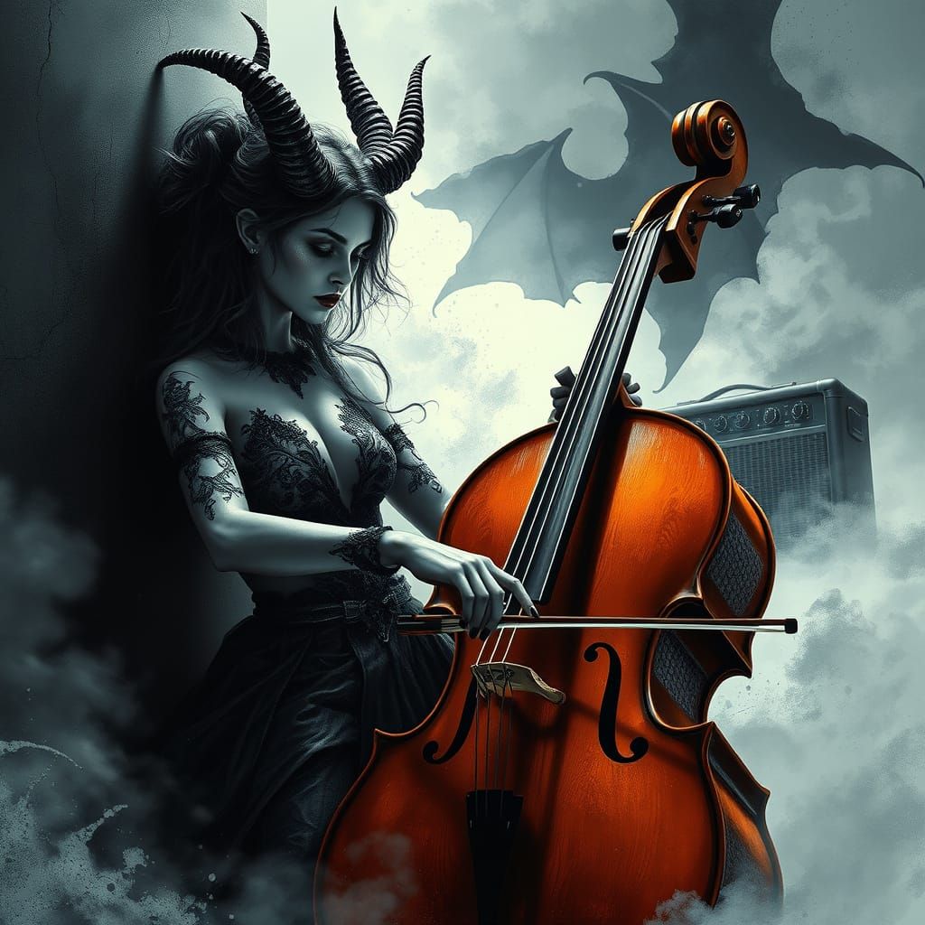 A photorealistic image of a devilish woman playing an electric cello in spooky fog. Features high contrast, dynamic lighting, and splash art highlights for a macabre feel.