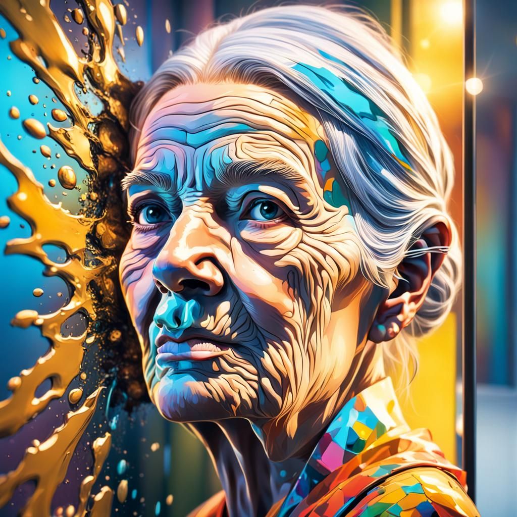 This image portrays a young woman's reflection in a mirror as an old woman. The artwork is intricately detailed with a colorful background, rendered in a splash art style.