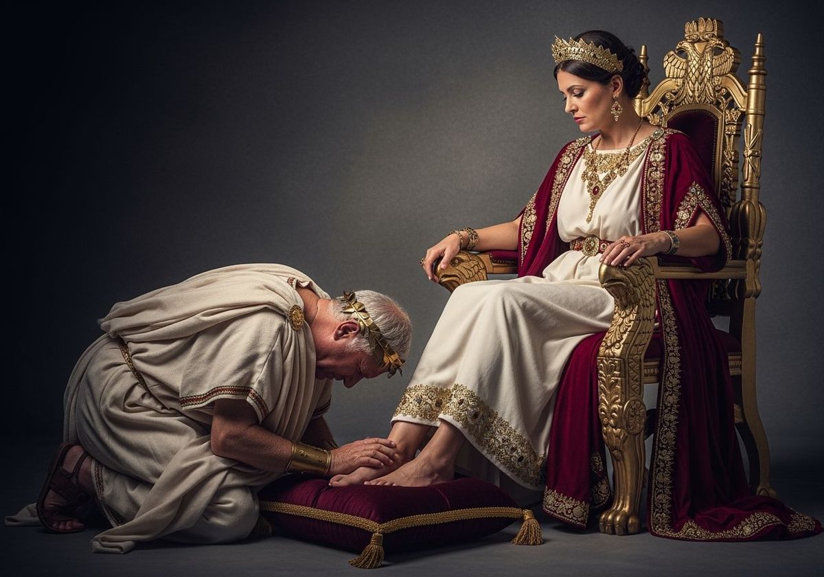This image shows a Roman Empress on her throne, a senator kneeling before her. Captured with professional photography techniques, the composition uses soft lighting and shallow depth of field.
