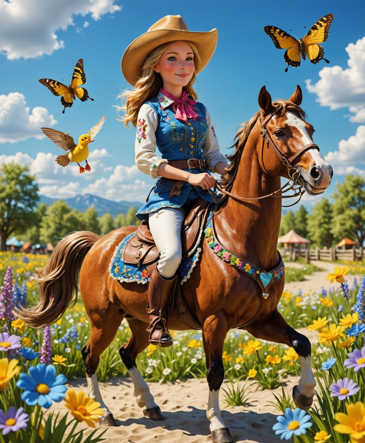 This image shows an anthropomorphic cowgirl on horseback at the beach. The 3D render depicts a colorful scene with a flower meadow, duck, blue sky, butterflies, gold glitter and bright spring light.