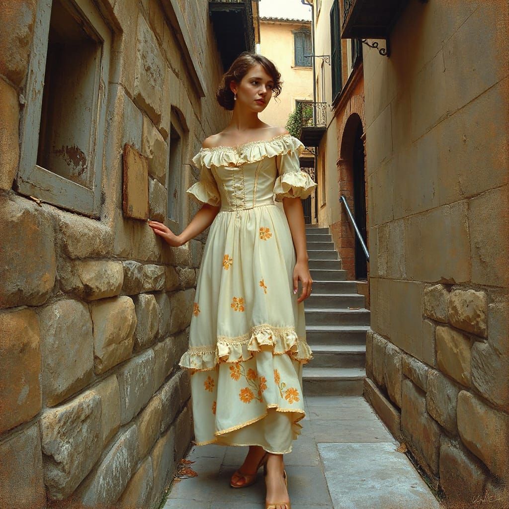 A woman in a cream gown with orange floral patterns stands by a stone wall. Soft, muted tones and warm light create a scene that blends impressionism and hyperrealism.
