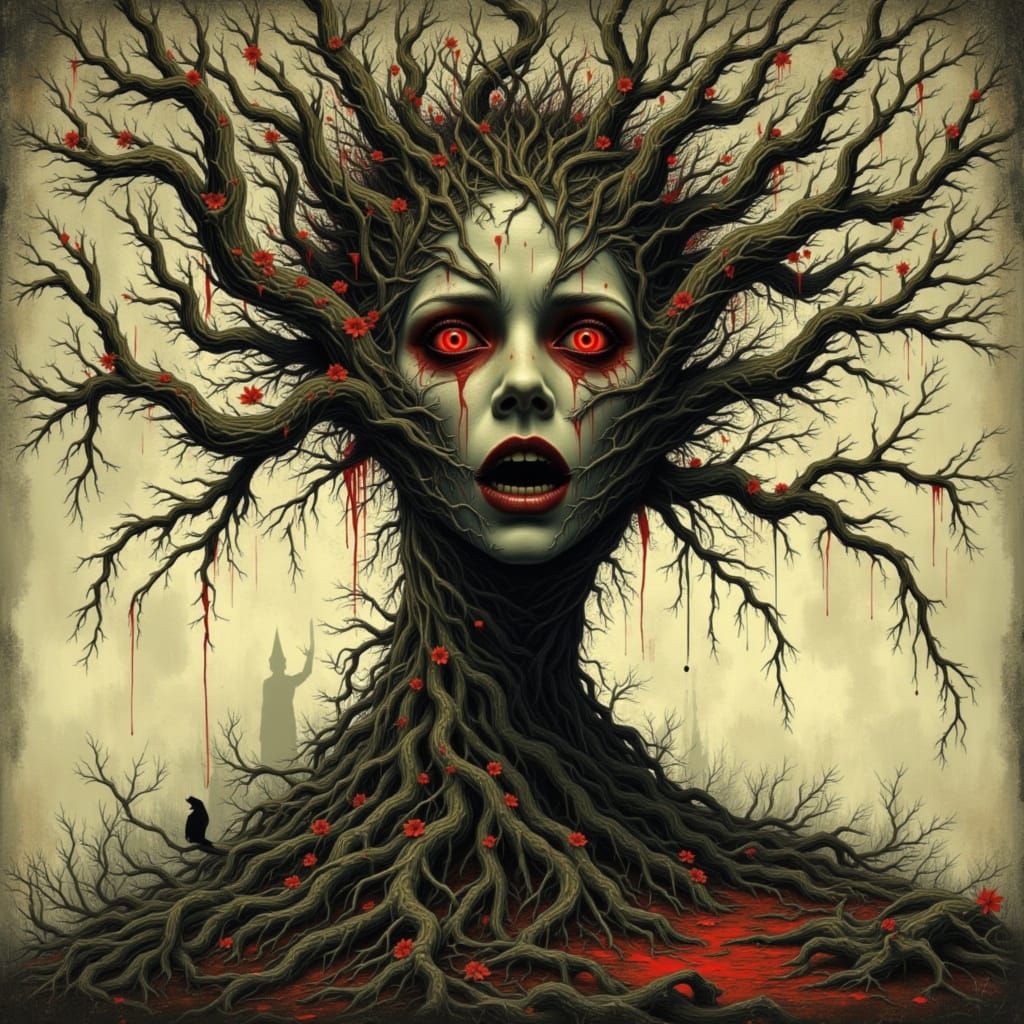 This abstract horror image depicts a giant tree with autumn colors, humanistic features, and thorny vines, embodying a lost love. Rooted in analog horror style.