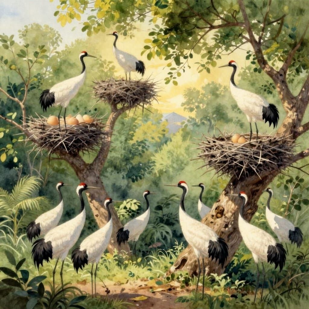This image shows majestic cranes perched on ancient trees with nests. Sunlight filters through lush foliage, creating a warm, golden glow in a detailed, painterly style.