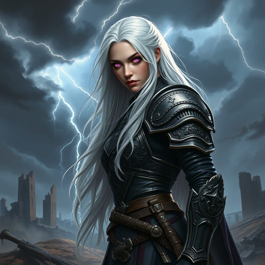 A regal warrior princess stands strong on a war-torn landscape, her one purple eye blazing with determination. The dramatic scene is illuminated by lightning, set against a dark and stormy sky with vibrant colors and ornate details reminiscent of Unreal Engine 5 graphics.