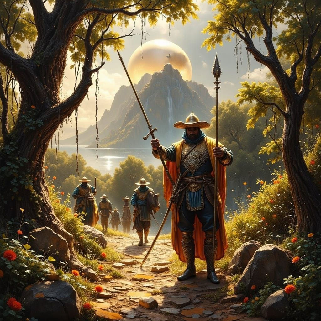 "<lora:Flux enhancer:1.0> <lora:Exquisite Flux:1.0> <lora:Flux Hyperreal:1.0> <lora:divineOil:1.0> Close up of 1537 Spanish conquistadors action danger adventures as they seek the fabled city of El Dorado. Action danger south American breathtaking terrain, jaguar exotic birds flowers muskets swords glittering incan city of gold gorgeous views danger jaguar Incan city of gold"