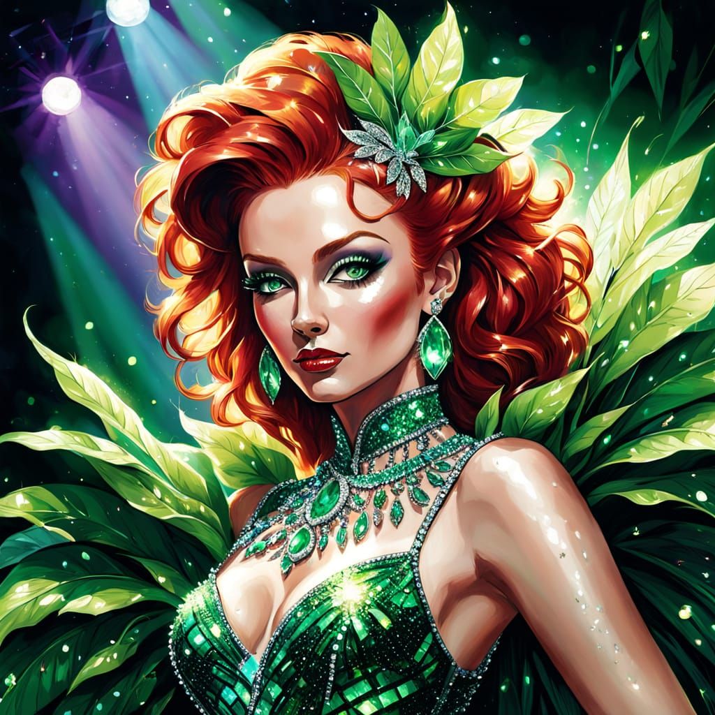 This image is a dynamic oil painting of a red-haired showgirl wearing a stunning costume adorned with green leaves and rhinestones, set against a backdrop of colorful lights and stage lights.