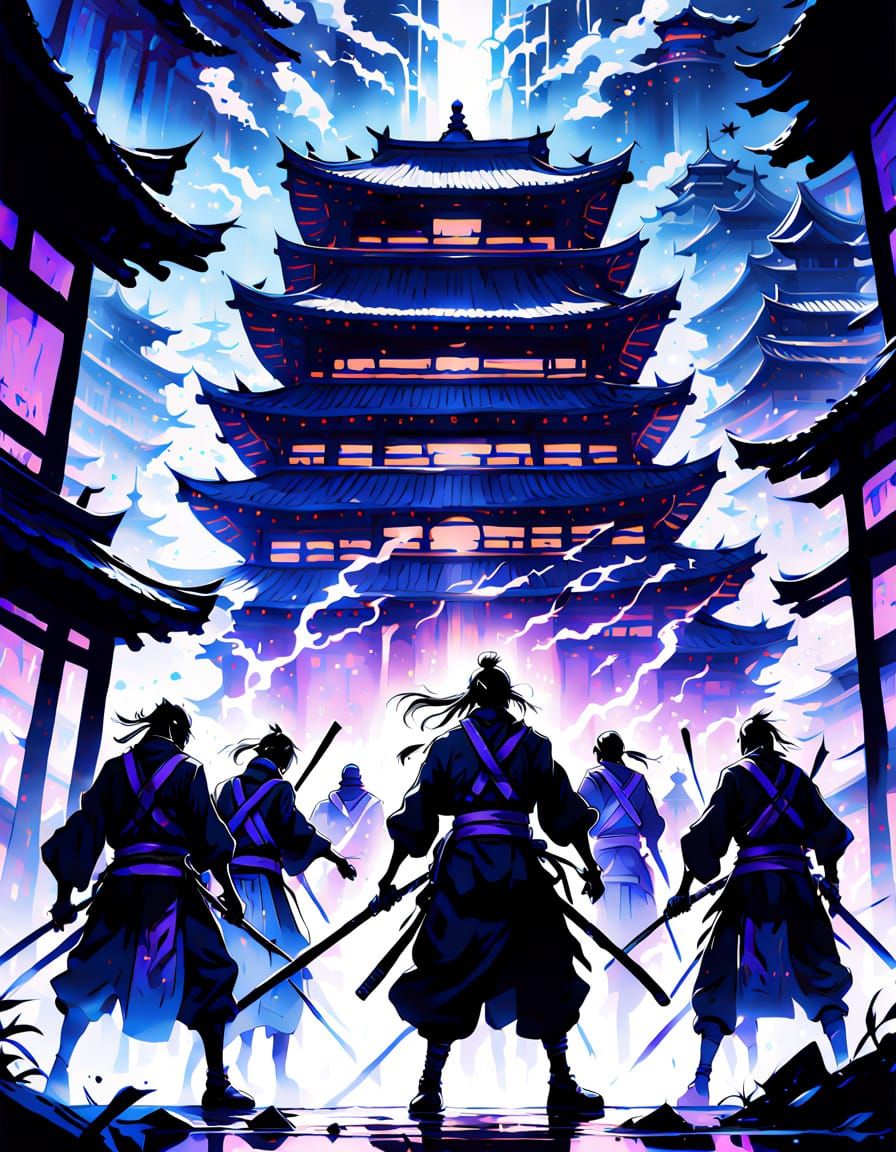This dynamic anime illustration depicts an army of shadow ninjas attacking an ancient temple. Features include dark energy trails, gleaming katanas, and dramatic purple and blue backlighting. Digital art, highly detailed.