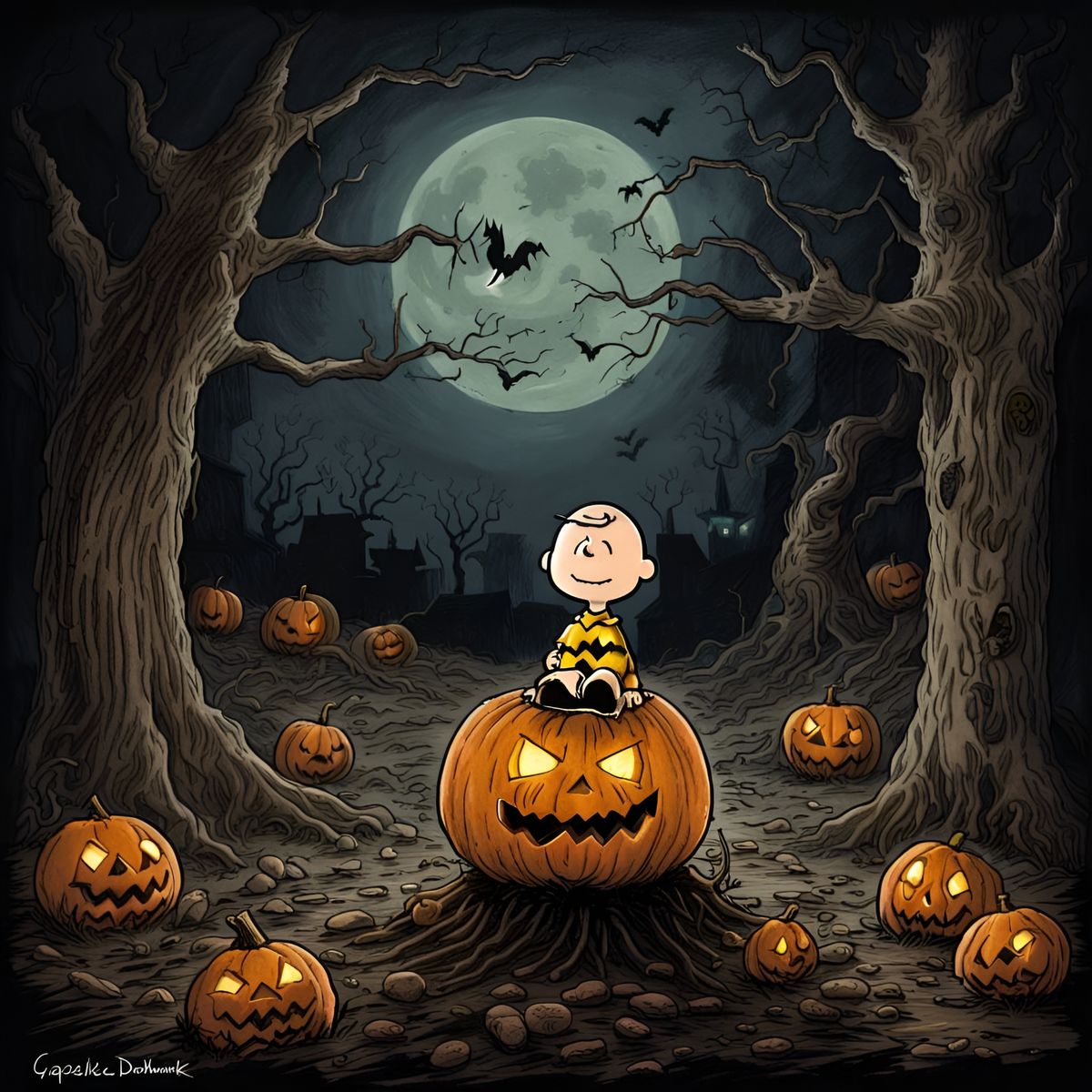 This image shows a sinister Halloween scene featuring Charlie Brown in a cursed landscape. The artwork evokes a horror aesthetic with detailed engravings.