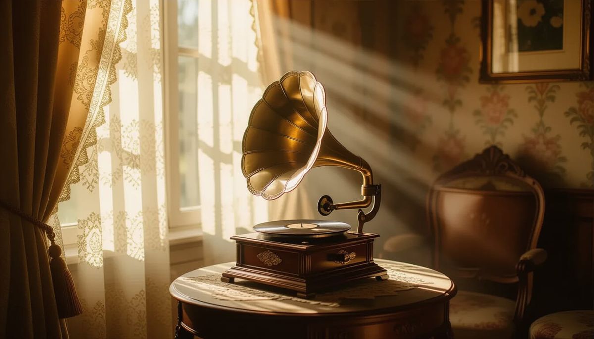 This image captures a vintage gramophone playing jazz amidst delicate lace curtains and a sunbeam, rendered in an Art Nouveau aesthetic with intricate details and a nostalgic, warm glow.
