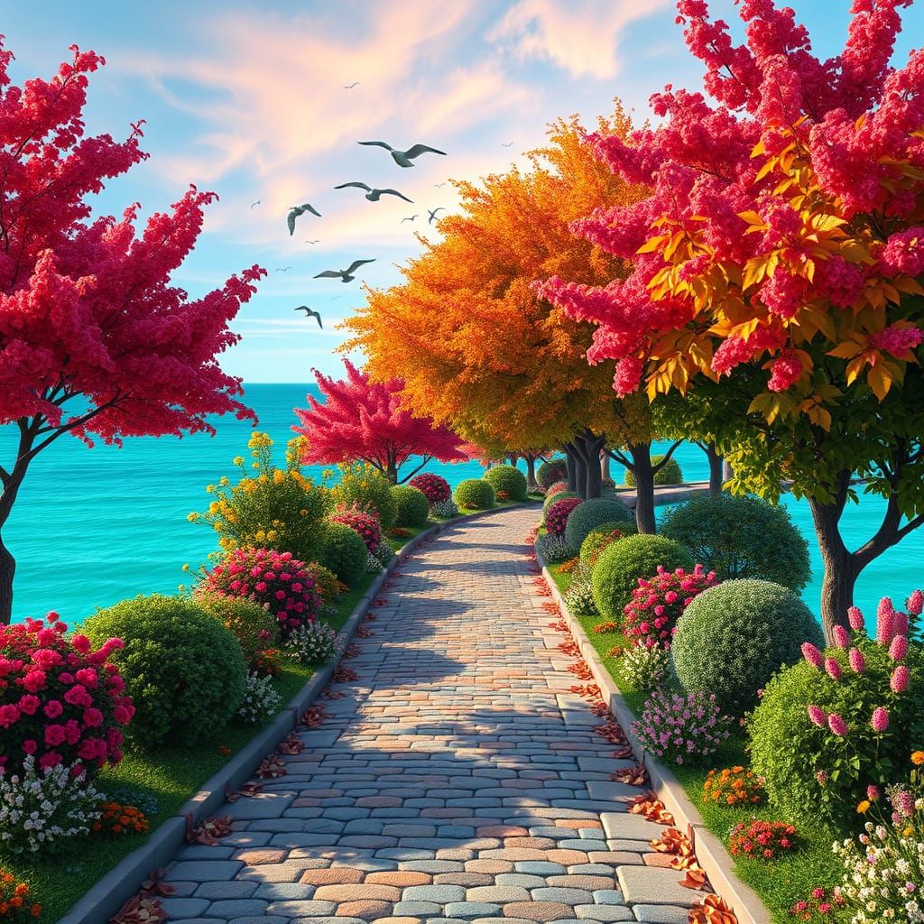 This image depicts a breathtakingly detailed and realistic world of vibrant colors, featuring lush trees with colorful leaves, a cobblestone path, and a serene sea green ocean, set against a backdrop of birds flying in the sky.