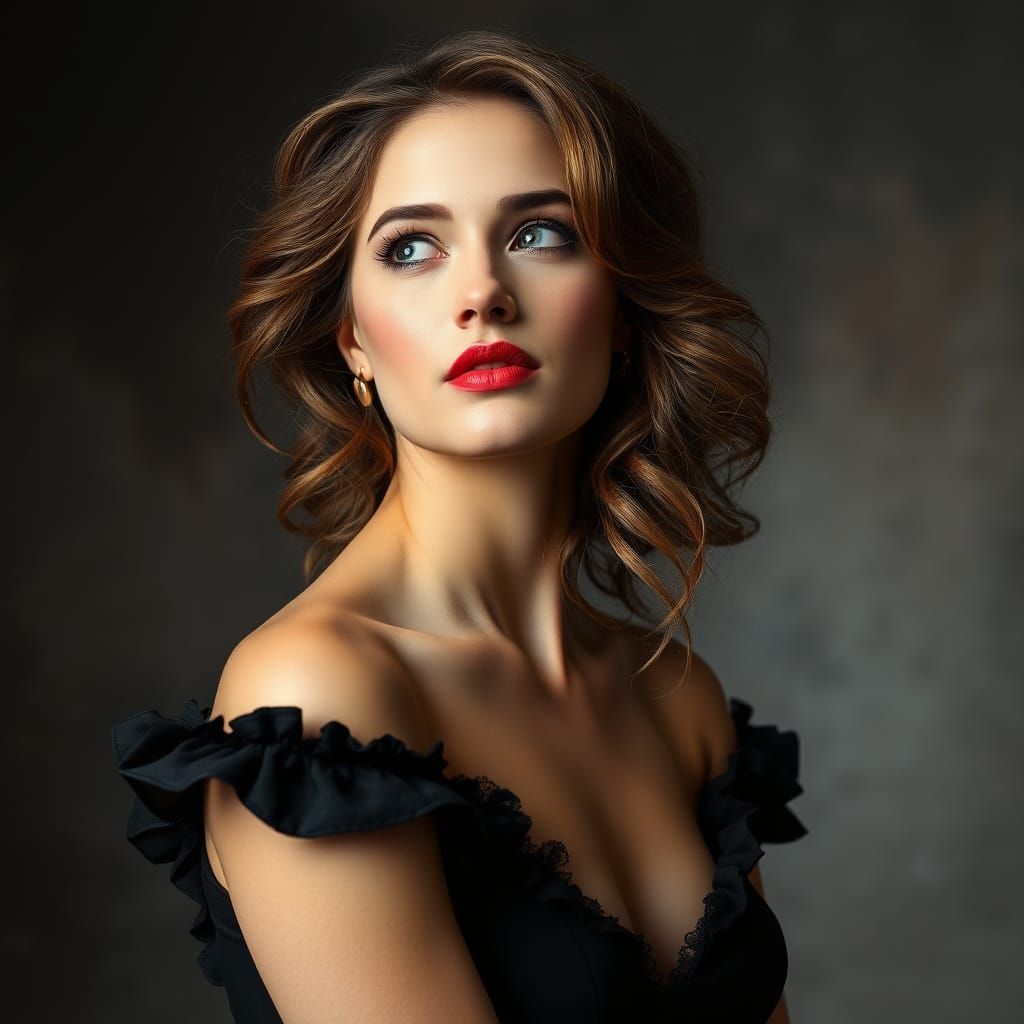 This photorealistic image captures an elegant young woman with soft waves in her light brown hair, wearing a black off-the-shoulder gown. Soft studio lighting enhances her captivating gaze and rosy cheeks in this fine art portrait.