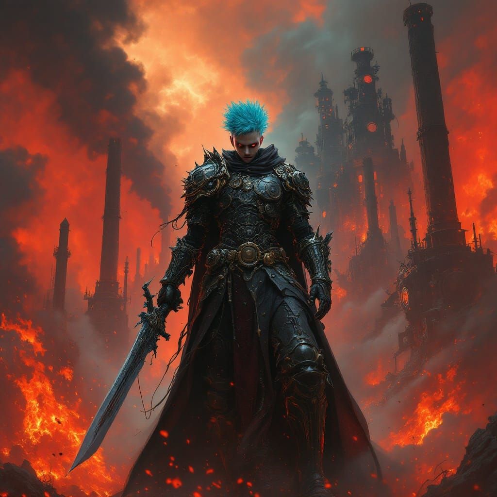 A gothic knight with neon-blue hair and clockwork armor stands on a steam-powered war machine. The machine marches through a smoky, fiery battlefield in a steampunk fantasy style.