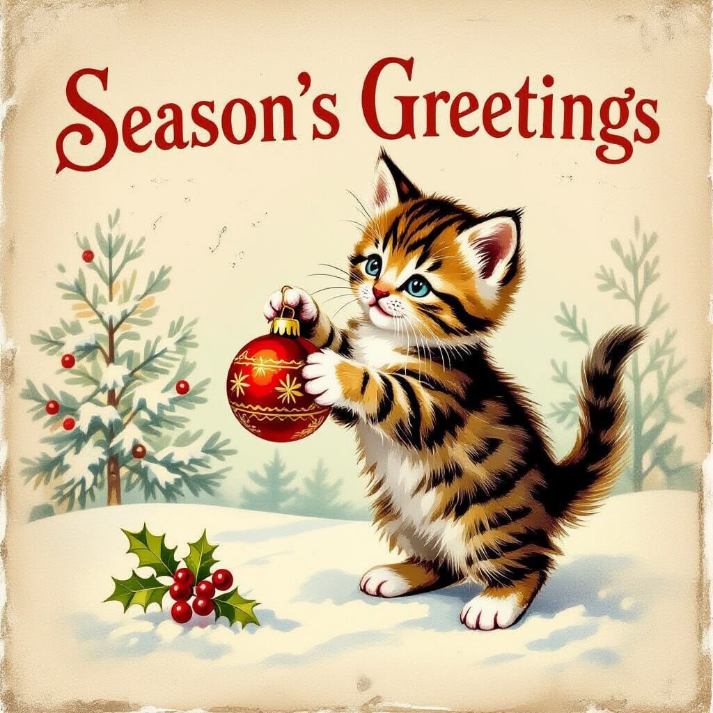 This image displays a nostalgic vintage Christmas card featuring an adorable kitten reaching for an ornament. The design has faded colors and aged edges for an authentic, old-world feel.