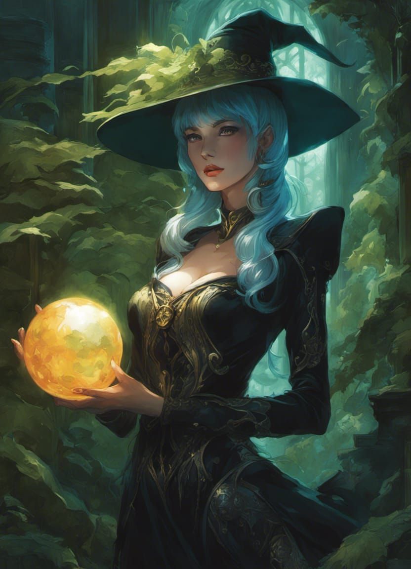 This image shows a stunning elven witch in a bioluminescent library, holding an orb. The artwork is detailed and vibrant, featuring ethereal shadows and a sleek, modern fantasy aesthetic.